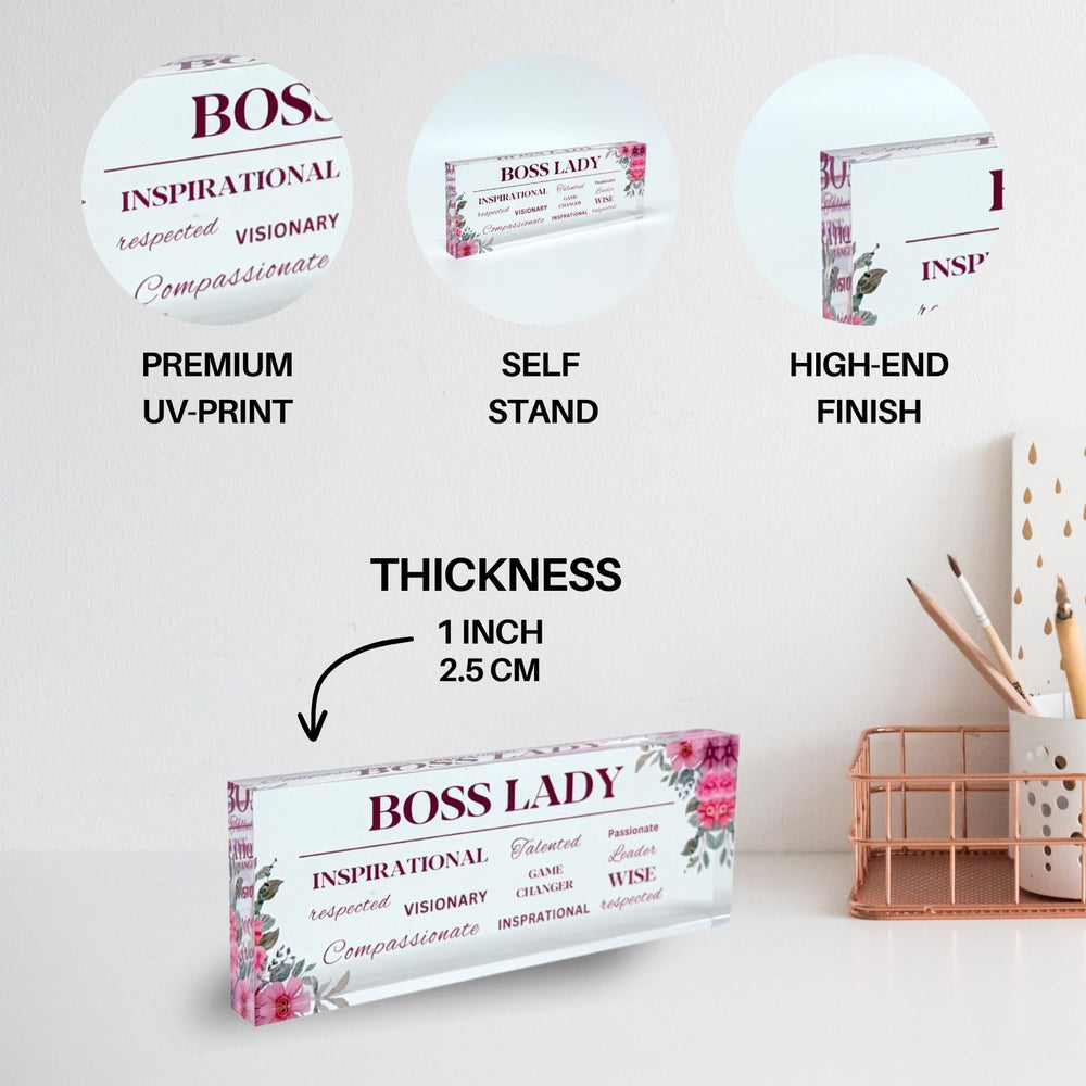 Crafted from thick, premium-quality acrylic with a polished, floating text effect, it’s the perfect desk accessory or gift for coworkers, bosses, or anyone who loves to blend elegance with personality. A must-have for those who want their space to inspire success.